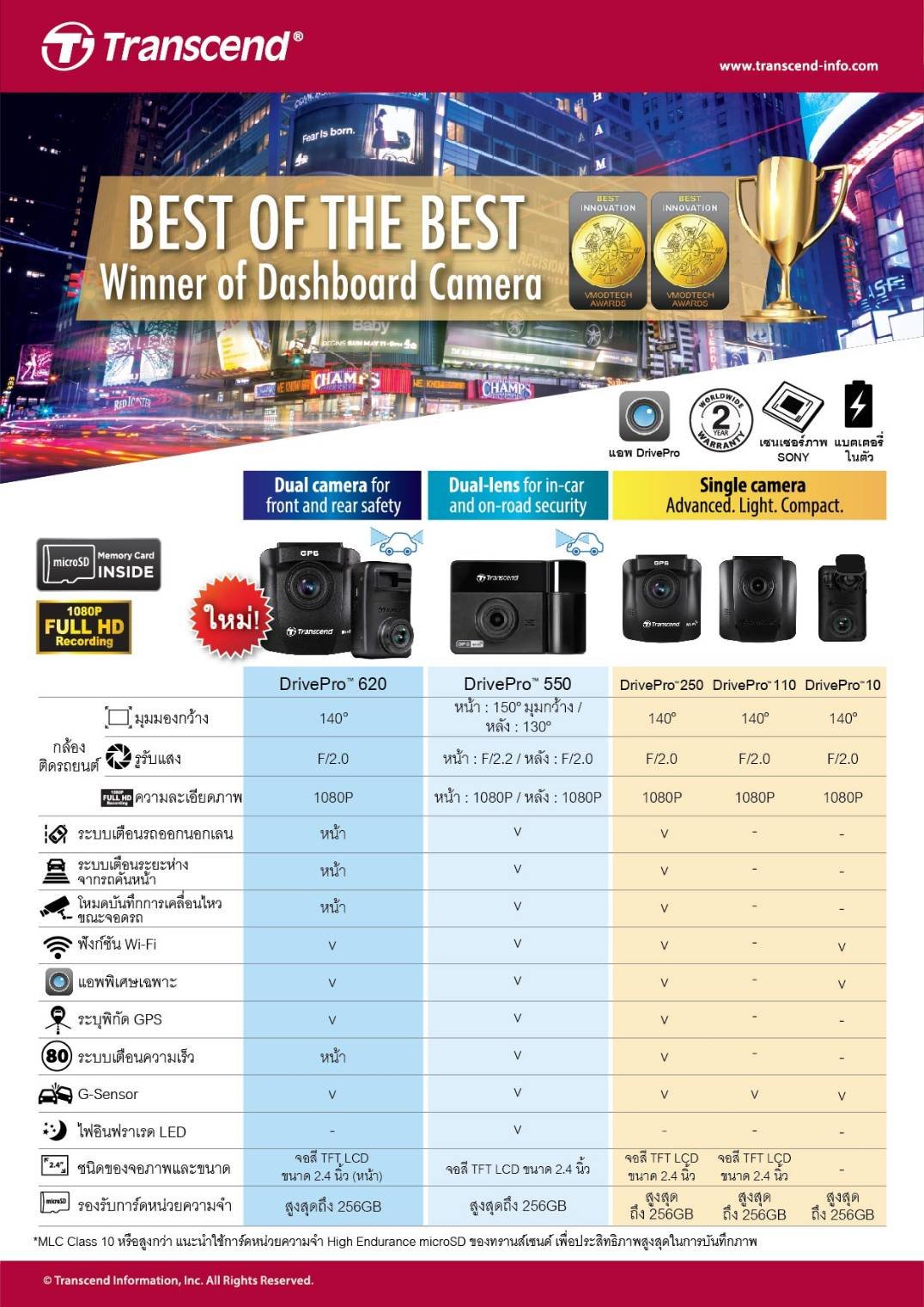 ตารางเปรียบเทียบคุณสมบัติกล้องติดรถ Transcend DrivePro