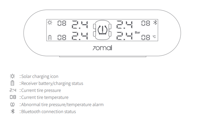 - ชื่อบลูทูธของระบบตรวจสอบความดันลมยางจะแสดงเป็น“ 70mai_t00_xxxx” โดยที่ “xxxx” หมายถึงตัวเลขสี่หลักสุดท้ายของ IP บลูทูธของตัวรับ