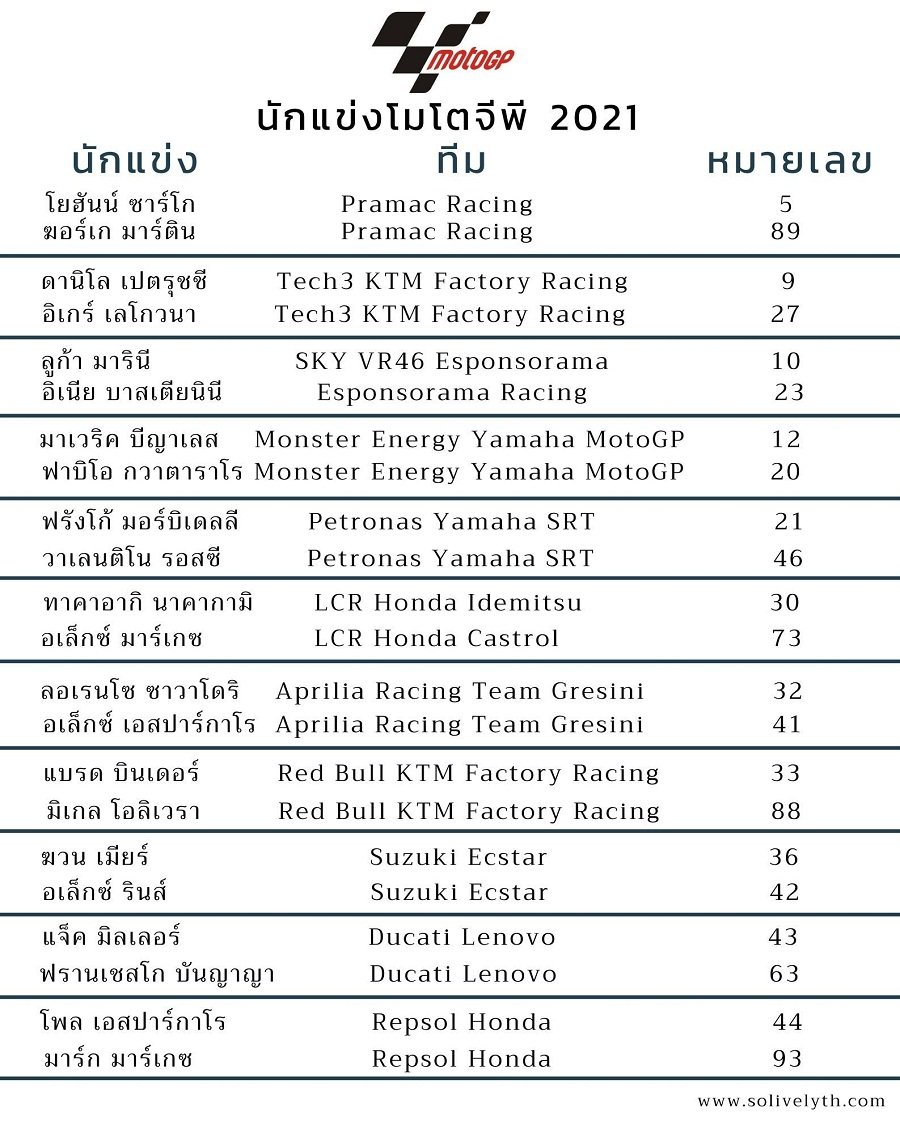 ฤดูกาลเก่าผ่านไปฤดูกาลใหม่กำลังจะมา การแข่งขันรถจักรยานยนต์ทางเรียบชิงแชมป์โลก MotoGP 2021 มีการเปลี่ยนแปลงตัวนักแข่งเกือบทุกทีม มีเพียงทีม  Suzuki Ecstar แชมป์เก่าทีมเดียวเท่านั้นที่ยังคงเป็นนักแข่งคู่หูคู่เดิมจากฤดูกาลที่แล้ว ปีนี้มีน้องใหม่โปรโมทขึ้นมาจากคลาส Moto2 ถึง 3 คน จะมีใครบ้างไปอัพเดตกันเลย