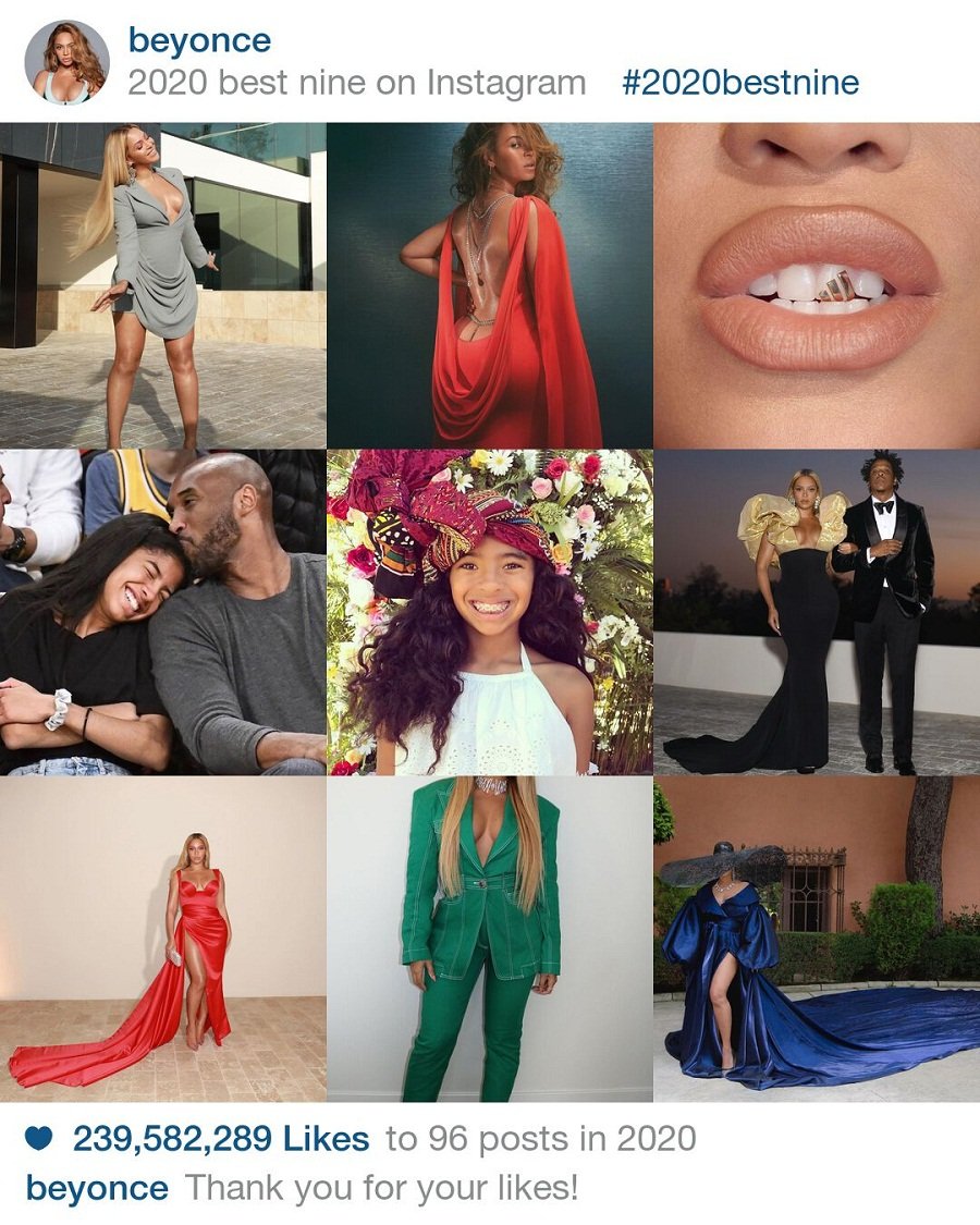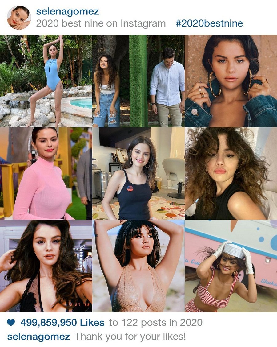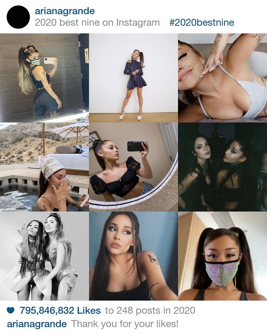 ในปีที่ผ่านมานักร้องสาวร่างเล็กคนนี้อัพเดตไป 248 โพสต์ น้อยกว่าปีที่แล้วที่เธอโพสต์รูปภาพและวิดีโอใน IG ส่วนตัวถึง 660 โพสต์ มีแฟนๆกดถูกใจทั้งสิ้น 795,846,832 ไลค์ น้อยกว่าปี 2019 เกือบเท่าตัว