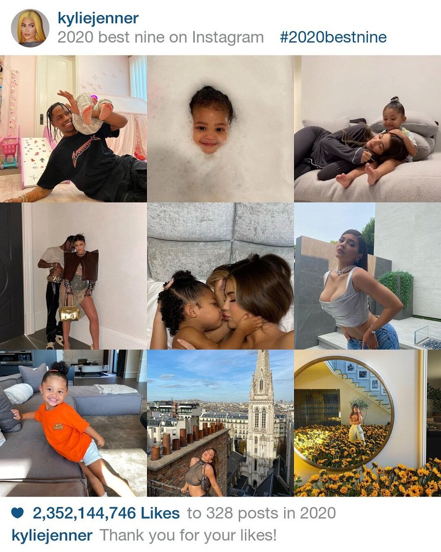 น้องเล็กแห่งบ้าน Kardashian–Jenner อัพเดตไป 328 โพสต์ ส่วนใหญ่รูปภาพที่ติดอันดับท็อป 9 ของคุณแม่ลูกหนึ่งคนนี้คือภาพความน่ารักของน้อง Stormi และมีแฟนๆกดถูกใจไปทั้งสิ้น 2,352,144,746 ไลค์ในปี 2020