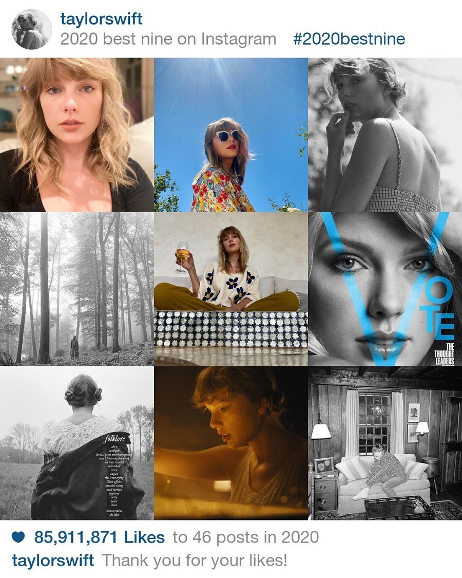 เทย์เลอร์เป็นซุปตาร์อีกคนที่มียอดโพสต์ลดลงจากปีที่แล้ว ปี 2019 เทย์เลอร์อัพเดตไป 165 โพสต์ แต่ปีนี้เธออัพเดตไปแค่ 46 โพสต์ มีแฟนๆกดถูกใจ 85,911,871 ไลค์