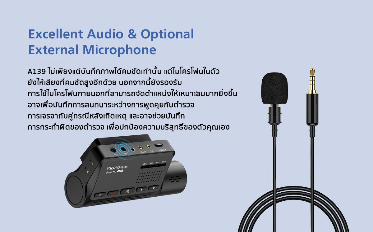 A139 ไม่เพียงแต่บันทึกภาพได้คมชัดเท่านั้น แต่ไมโครโฟนในตัวยังให้เสียงที่คมชัดสูงอีกด้วย นอกจากนี้ยังรองรับการใช้ไมโครโฟนภายนอกที่สามารถจัดตำแหน่งให้เหมาะสมต่อการบันทึกเสียงมากยิ่งขึ้น อาจเพื่อบันทึกการสนทนาระหว่างการพูดคุยกับตำรวจ การเจรจากับคู่กรณีหลังเกิดเหตุ และอาจช่วยบันทึกการกระทำผิดของตำรวจ เพื่อปกป้องความบริสุทธิ์ของตัวคุณเอง