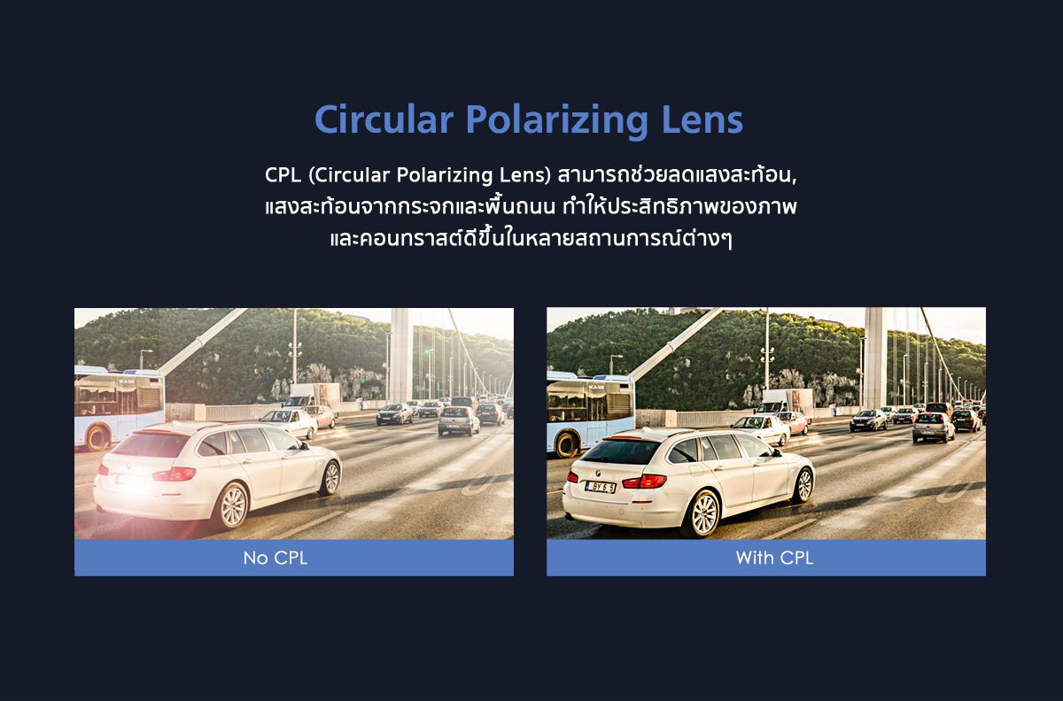 CPL (Circular Polarizing Lens) สามารถช่วยลดแสงสะท้อน แสงสะท้อนจากกระจกและพื้นถนน ทำให้ประสิทธิภาพของภาพและคอนทราสต์ดีขึ้นในหลายๆสถานการณ์