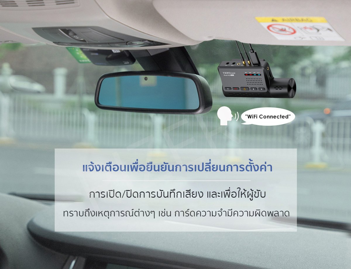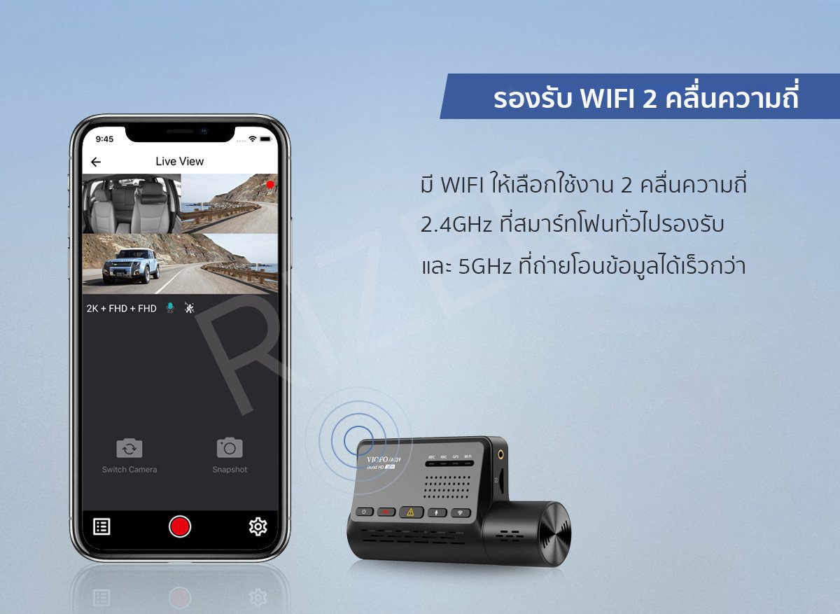 มี WIFI ให้เลือกใช้งาน 2 คลื่นความถี่ คือ 2.4GHz ที่สมาร์ทโฟนทั่วไปรองรับ และ 5GHz ที่ถ่ายโอนข้อมูลได้เร็วกว่า สามารถดาวน์โหลดข้อมูลสูงสุดได้ถึง 8MB/s การเชื่อมต่อ Wi-Fi และสั่งงานผ่านแอพ VIOFO บนมือถือ ช่วยให้ผู้ใช้ตั้งค่าการใช้งานได้อย่างสะดวก, เลือกดูภาพสดได้จากทั้ง 3 กล้อง, เล่นไฟล์วิดีโอที่บันทึกไว้ และดาวน์โหลดหรือแชร์วิดีโอไฟล์ได้อย่างง่ายดาย