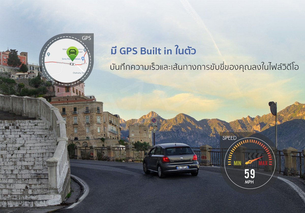 GPS สามารถบันทึกความเร็วและเส้นทางการขับขี่ของคุณลงในไฟล์วิดีโอ ซึ่งผู้ใช้จะสามารถเห็นข้อมูลเหล่านี้เมื่อเปิดดูไฟล์ย้อนหลัง(payback) นอกจากนี้ GPS ยังซิ้งข้อมูลกับดาวเทียม เพื่อตั้งวันที่และเวลาในกล้องให้แสดงบนไฟล์วิดีโอให้ตรงอัตโนมัติตลอดเวลา