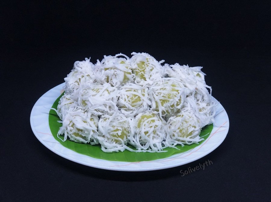 5. นึ่งมะพร้าวขูดฝอยผสมเกลือเล็กน้อยแล้วนำมาคลุกกับขนมต้มสุก