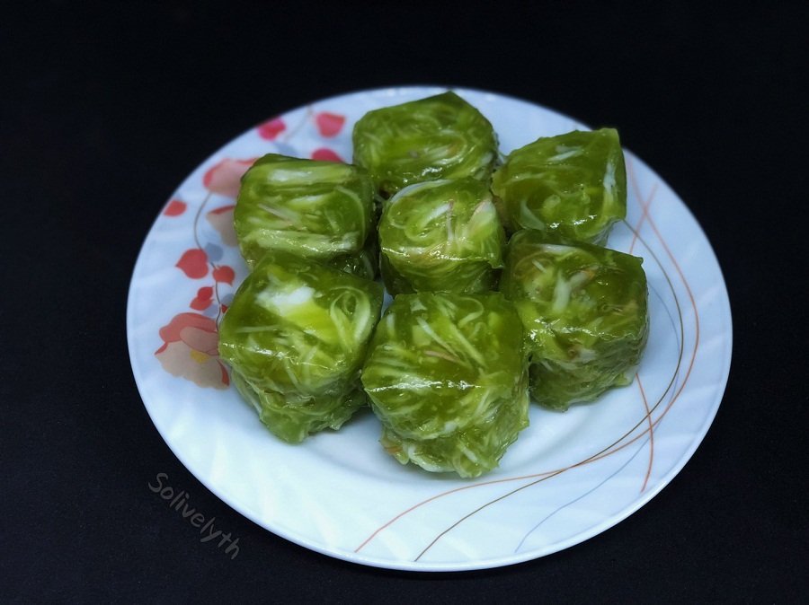 1. แช่ถั่วเขียวเลาะเปลือก 4 ชั่วโมง นำไปนึ่งให้สุกแล้วบดให้ละเอียด ผสมกระทิ น้ำตาล เกลือเล็กน้อย กวนให้แห้ง