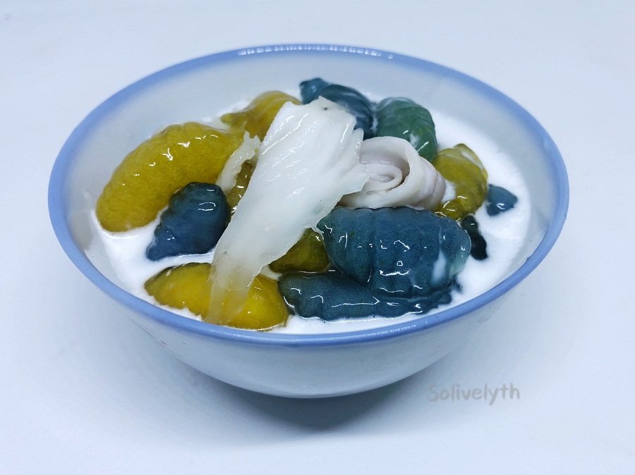 แป้งมัน(400 กรัม), ดอกอัญชัน, ฟักทอง,หัวกระทิสด(600 มล.), เนื้อมะพร้าวอ่อน(1 ลูก), น้ำตาลทราย(150 กรัม), เกลือ (1 1/4 ช้อนชา), น้ำร้อนจัด
