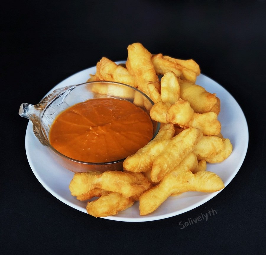 4. ตบให้แป้งบางประมาณ 0.5 ชม. ตัดให้มีความกว้างประมาณ 0.5 นิ้ว แตะน้ำเล็กน้อยแล้วประกบแป้ง 2 ชิ้นเข้าด้วยกัน ยืดแป้งก่อนนำไปทอดด้วยไฟกลางค่อนอ่อนให้สุกเหลือง