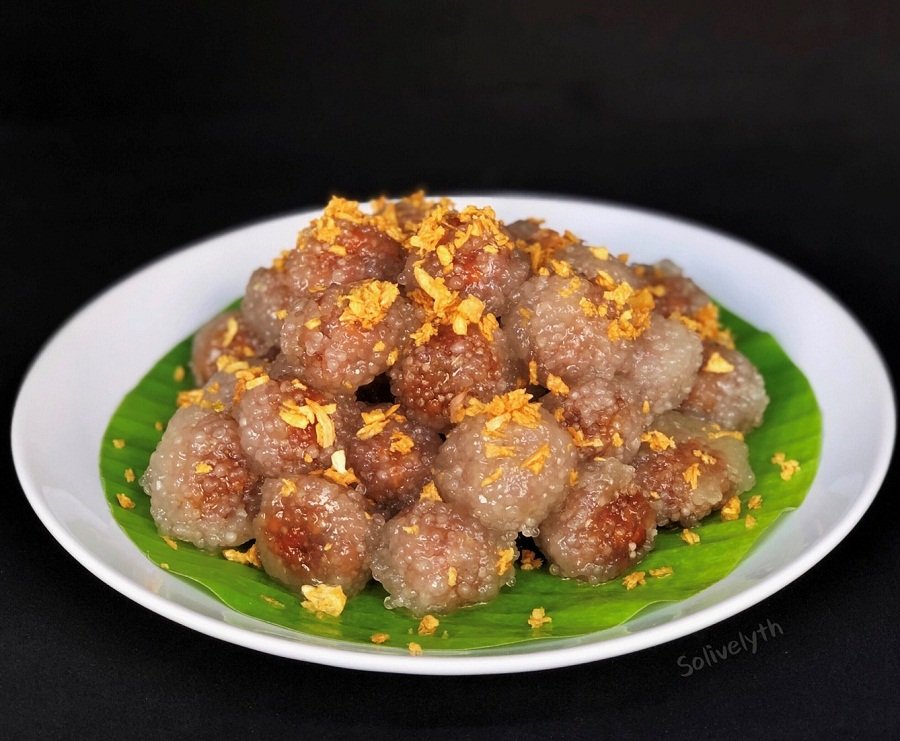 6. นำสาคูที่นึ่งสุกแล้วมาเรียงในภาชนะที่ทาด้วยน้ำมันแล้วโรยด้วยกระเทียมเจียว