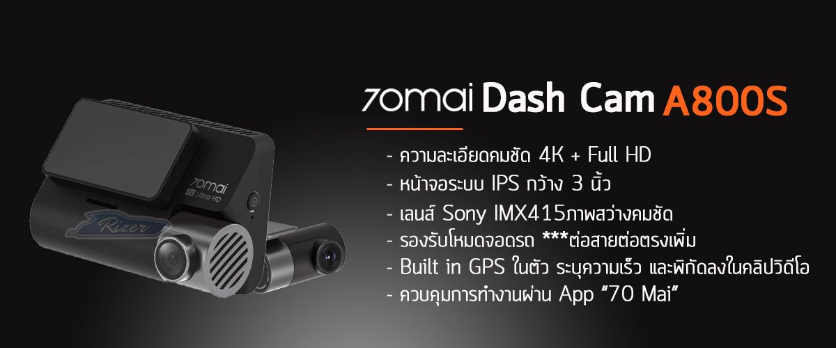 สำหรับรุ่นนี้ เหมาะกับท่านที่ต้องการภาพแบบคมชัดสุดๆโดยกล้องหน้าบันทึกความละเอียดได้ถึง 4K ที่สำคัญรุ่นนี้ยังรองรับการต่อกล้องหลังที่มาพร้อมความคมชัดระดับ Full HD ยังไม่รวมคุณสมบติเด่นอื่นๆ เช่น มุมมองกล้องกว้าง 140 องศา เก็บเหตุการณ์ได้ครอบคลุม หน้าจอแบบ IPS กว้าง 3 นิ้ว แสดงผลคมชัด หมดกังวลเรื่องการดาวน์โหลดไฟล์ด้วยการเชื่อมต่อผ่าน app 70Mai ไม่ว่าจะแชร์ไฟล์ ดูพรีวิว ก็ทำได้ง่ายๆผ่านมือถือ ยิ่งไปกว่านั้น A800S ยัง Built in GPS ในตัว ที่ระบุความเร็วและพิกัดเส้นทางการขับขี่ลงในคลิปวิดีโอได้ เพื่อชี้แจงกับตำรวจกรณีเกิดอุบัติเหตุได้ (บอกได้เลยว่าเราขับมาด้วยความเร็วเท่าไหร่)