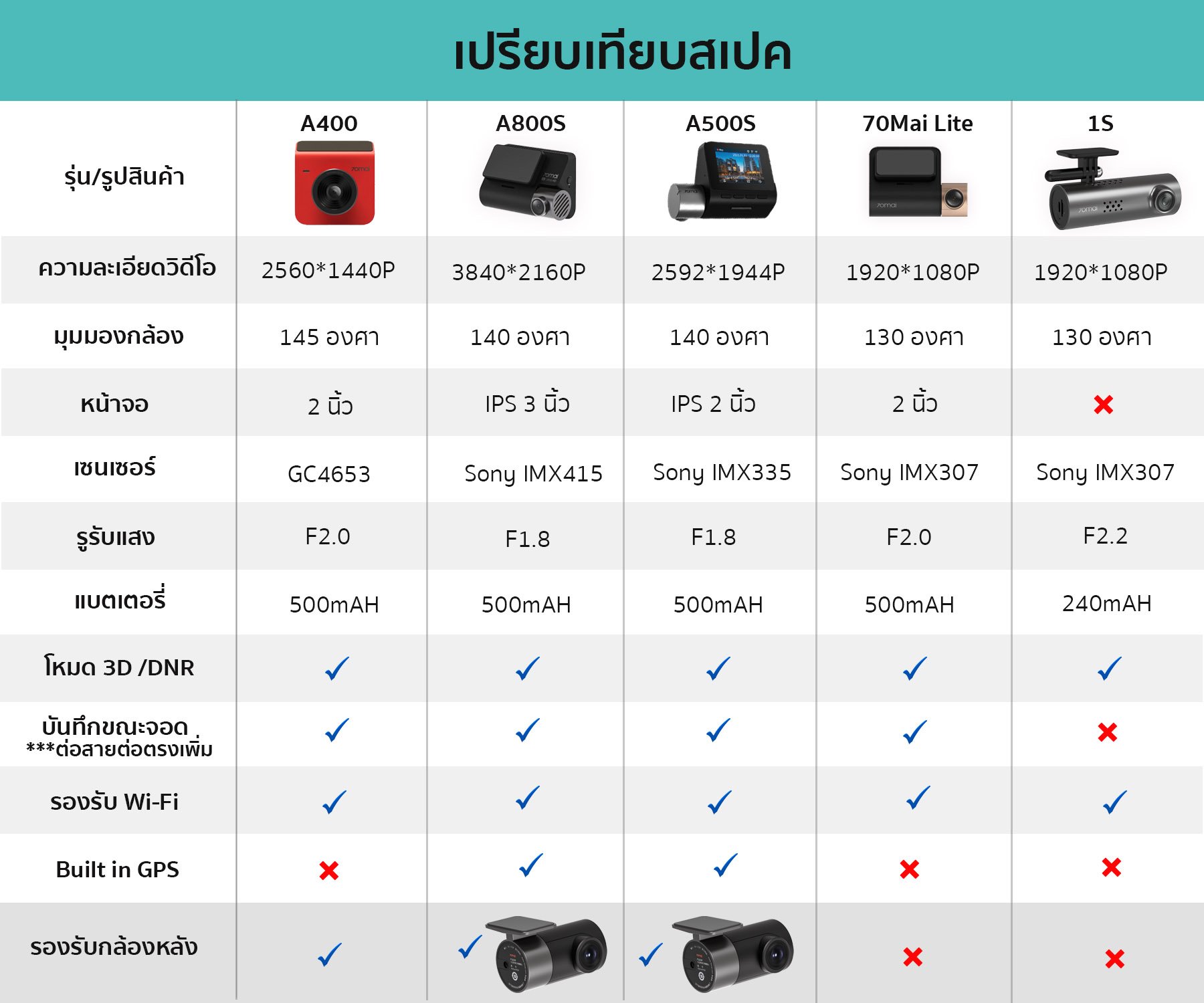 ดูตารางเปรียบเทียบคุณสมบัติรุ่นต่างๆของ 70Mai กันได้เลยครับ