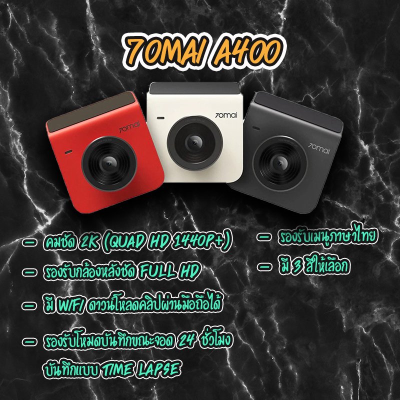 น้องใหม่มาแรงจาก 70Mai ที่เน้นดีไซน์โฉบเฉี่ยว ขนาดกล้องไม่เล็กไม่ใหญ่จนเกินไป และมีมาให้เลือกกันถึง 3 สี A400เหมาะกับไลฟ์สไตล์ยุคใหม่ที่คนรักรถต้องชอบแน่นอนครับ (กล้องรุ่นอื่นๆแทบจะไม่มีรุ่นไหนผลิตออกมาหลากหลายสีสันแบบรุ่นนี้เลยครับ) ที่สำคัญเลย A400 รุ่นนี้เค้ารองรับเมนูภาษาไทยมาให้ ใช้งานง่าย เหมาะกับใครหลายๆคนที่รอคอยกล้องติดหน้ารถจาก 70Mai ที่ใช้งานเป็นภาษาไทยเลยครับ