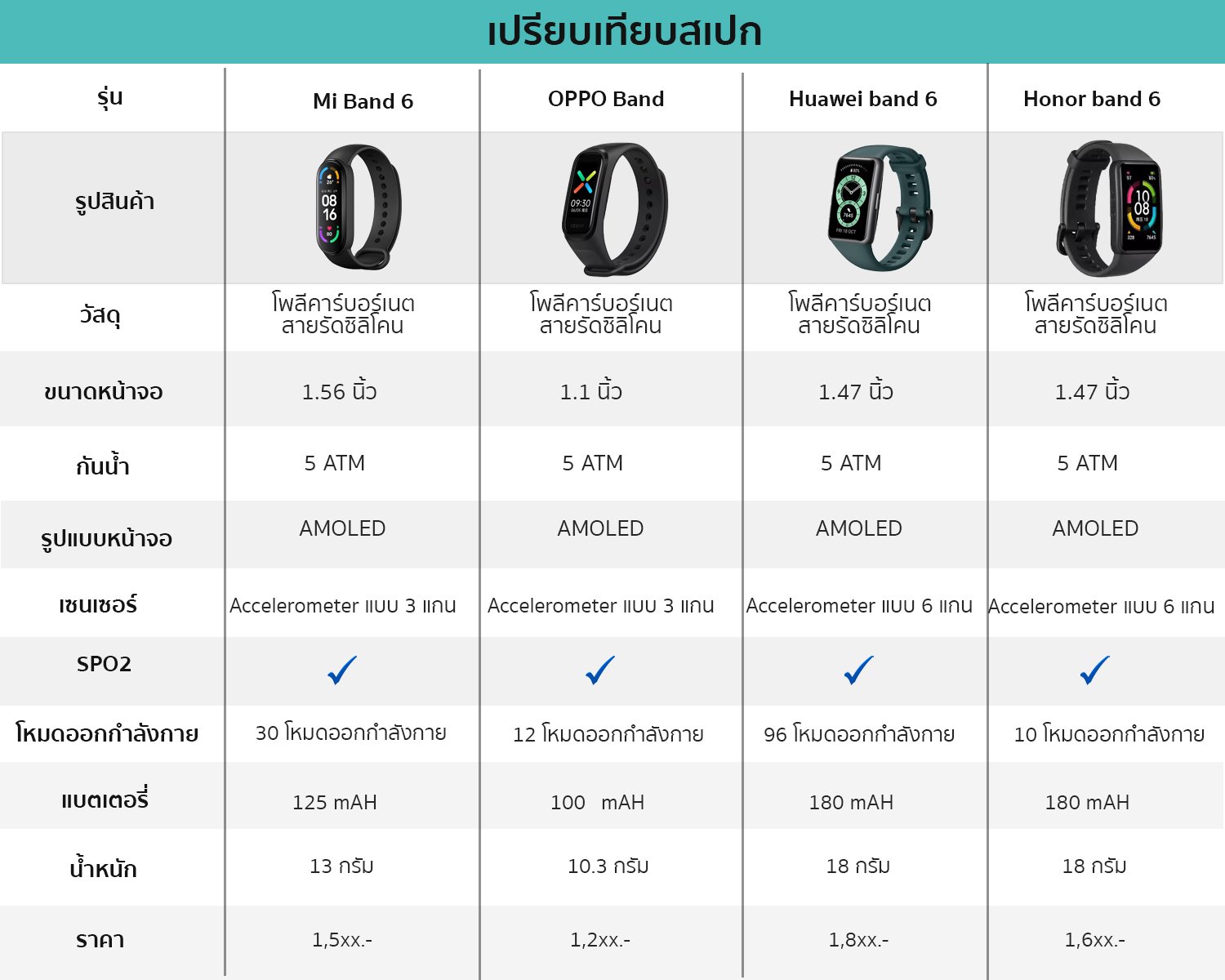 เป็น Smart Band ตัวแรกของ OPPO ที่เปิดตัวมาด้วยฟังก์ชั่นเด็ดหลายอย่าง มีทั้งการวัดออกซิเจนในเลือด วัดอัตราการเต้นของหัวใจ รองรับโหมดออกกำลังกาย 12 โหมด แต่จะมีขนาดหน้าจอเล็กกว่า Mi Band 6 การแจ้งเตือนเมนูเป็นภาษาไทย รองรับเมนูไทย แบตเตอรี่อึด อยู่ได้นานถึง 12 วัน ฟังก์ชั่นอื่นๆจะคล้ายกับ Mi Band 6 ถ้าเทียบกันแล้ว เด่นๆเลยคือ ต่างกันที่ Mi Band 6 รองรับโหมดออกกำลังกายได้ 30 โหมด กับหน้าจอใหญ่กว่า แอดว่าสวยเหมือนกัน ฟังก์ชั่นคล้ายๆกัน อยู่ที่ใครเป็นสาวกของแบรนด์ไหน แค่นั้นเอง ^^ ยังไงก็อยู่ที่เพื่อนๆตัดสินใจกันครับ