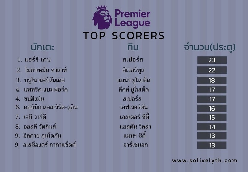 แฮร์รี เคน ยิงเพิ่มในนัดสุดท้าย 1 ประตู ยิงรวม 23 ประตูมากกว่าโมฮาเหม็ด ซาลาห์ 1 ประตู คว้ารางวัลโกลเดน บูท ประจำฤดูกาลนี้ไปครอง