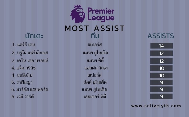 แฮร์รี เคน คือนักเตะที่แอสซิสต์มากที่สุดในฤดูกาลนี้ ทั้งยิงทั้งจ่ายฟอร์มการเล่นฮ็อตสุดๆไปเลยสำหรับนักเตะคนนี้ ส่วนเควิน เดอ บรอยน์ ฤดูกาลนี้ทำไป 12 แอสซิสต์น้อยกว่าฤดูกาลที่แล้ว 8 แอสซิสต์