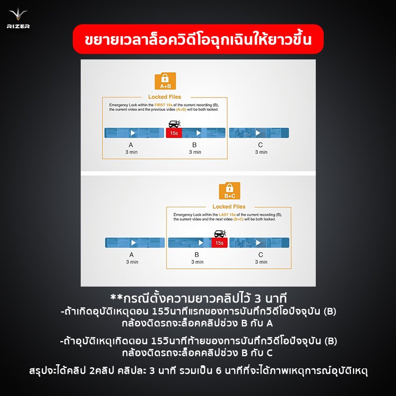 แต่ถ้าอุบัติเหตุเกิดตอน 15 วินาทีท้ายของการบันทึกวิดีโอปกติในปัจจุบัน (B) กล้องติดรถยนต์จะล็อคคลิปช่วง B กับ C