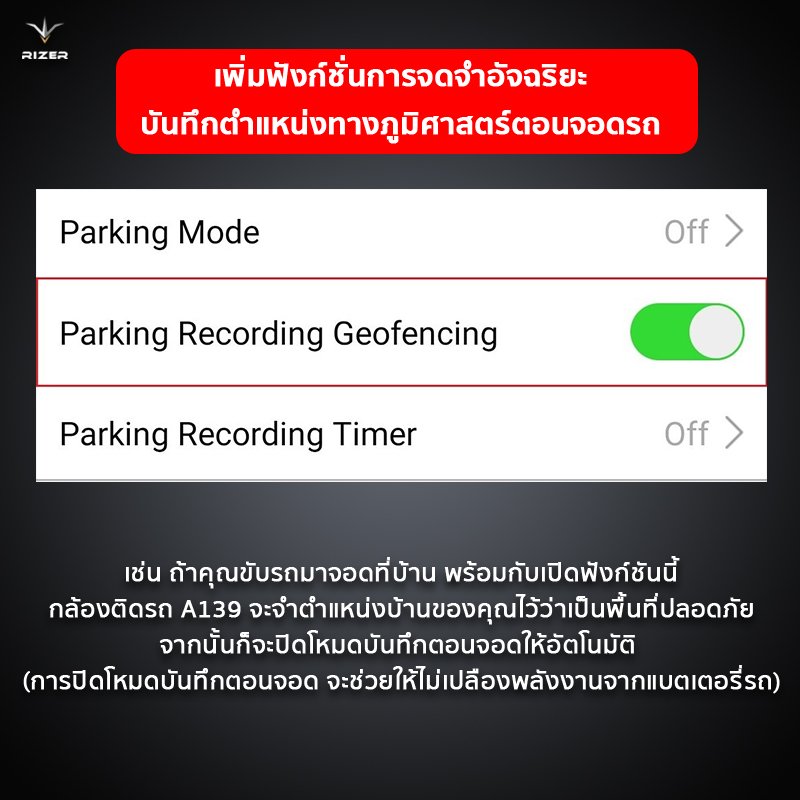 ฟังก์ชันบันทึกตำแหน่งทางภูมิศาสตร์ตอนจอดรถในกล้องติดรถยนต์ VIOFO A139 เป็นฟังก์ชั่นที่ระบุตำแหน่งทางภูมิศาสตร์อย่างชาญฉลาด เช่น เมื่อคุณขับรถมาจอดที่บ้าน พร้อมกับเปิดฟังก์ชันบันทึกตำแหน่งทางภูมิศาสตร์ตอนจอดรถ กล้องติดรถยนต์ VIOFO A139 จะจดจำตำแหน่งบ้านของคุณไว้ว่าเป็นพื้นที่ปลอดภัย ไม่เสี่ยงต่อการเกิดอุบัติเหตุ เลยปิดโหมดบันทึกตอนจอดให้อัตโนมัติ (การปิดโหมดบันทึกตอนจอด จะช่วยให้ไม่เปลืองพลังงานจากแบตเตอรี่รถนั่นเองค่ะ) และครั้งต่อ ๆ ไป เมื่อคุณขับรถกลับมาบ้านในระยะพื้นที่ 1 กม. กล้องติดรถยนต์ VIOFO A139 จะจำได้ว่าเป็นพื้นนี้เป็นพื้นที่ปลอดภัยก็จะปิดโหมดบันทึกตอนจอดเมื่อคุณจอดรถที่บ้านให้อัตโนมัติทุกครั้งนั่นเองค่ะ