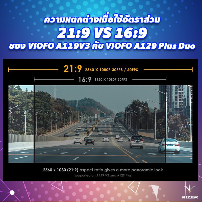 จากภาพคุณจะเห็นว่าความละเอียดในแนวตั้งของภาพนั้นเท่ากัน คือ 1080 ส่วนความละเอียดในแนวนอนอัตราส่วนภาพของ 21:9 เท่ากับ 2560 ส่วนอัตราส่วนภาพของ 16: 9 เท่ากับ 1920 ซึ่งจะเห็นว่า อัตราส่วนภาพของ 21:9 นั้นกว้างกว่า เลยทำให้มุมมองแนวนอนอัตราส่วนภาพของ 21:9 นั้นมีความกว้างมากขึ้น ส่วนมุมมองแนวตั้งนั้นจะแคบลง เมื่อเปิดดูคลิปวิดีโอที่บันทึกได้จากกล้องติดรถยนต์ VIOFO A119V3 กับ กล้องติดรถยนต์ VIOFO A129 Plus Duo จะเห็นถนนได้มากขึ้น และเห็นท้องฟ้ากับแผงหน้าปัดรถยนต์ ได้น้อยลงนั่นเอง