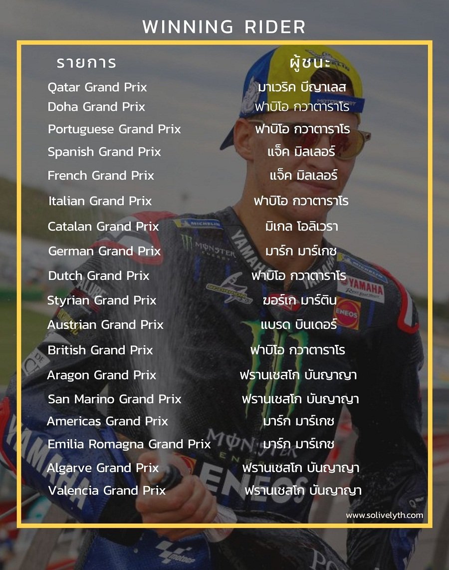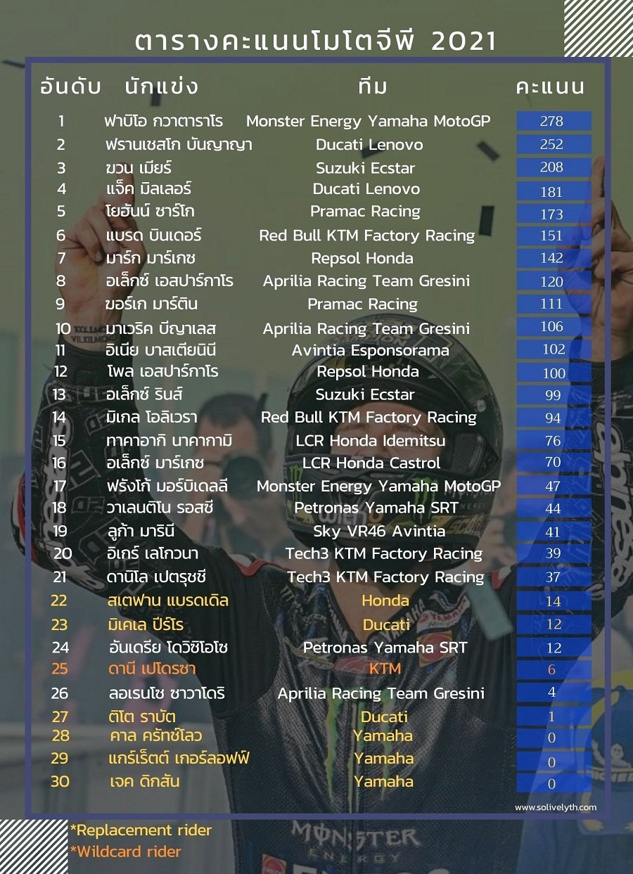 ฟาบิโอ กวาตาราโร นักบิดชาวฝรั่งเศสจากทีม Monster Energy Yamaha MotoGP มี 278 คะแนน คว้าแชมป์โลกสมัยแรกในวัย 22 ปี หลังจากอกหักพลาดแชมป์โลกในฤดูกาล 2019 และ 2020 ในที่สุดปีนี้เจ้าแตงกวาก็ทำได้สำเร็จ