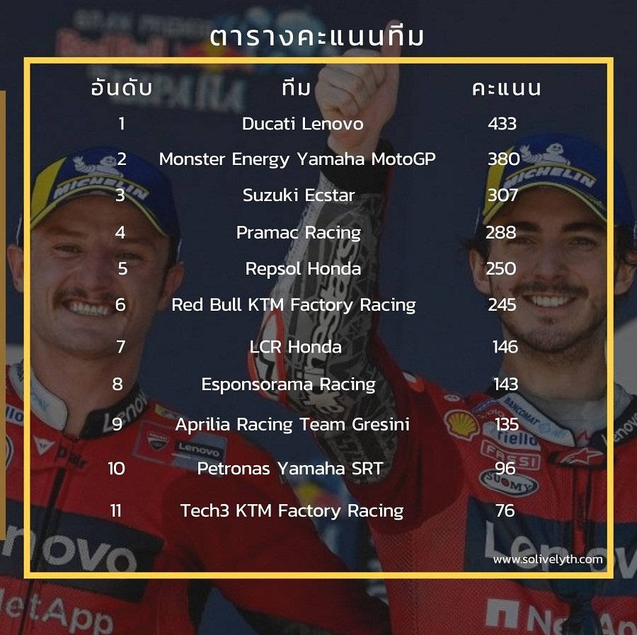 ทีม Ducati Lenovo เก็บไป 433 แต้ม จากฟรานเชสโก บันญาญา 252 แต้ม จากแจ็ค มิลเลอร์ 181 แต้ม คว้าแชมป์โลกประเภททีมไปครอง ในขณะที่คู่แข่งอย่าง Monster Energy Yamaha MotoGP มีปัญหาเปลี่ยนตัวนักแข่งกลางฤดูกาลและมีปัญหาบาดเจ็บ แทบจะไม่มีใครมาช่วย ฟาบิโอ กวาตาราโร เก็บคะแนนให้กับทีมเลย ทีมโรงงานยามาฮ่าจึงพลาดแชมป์โลกประเภททีมไปในปีนี้ ส่วนทีม Satellite ที่ทำคะแนนสูงสุดในฤดูกาลนี้คือทีม Pramac Racing ทีมรองของ Ducati เก็บไปถึง 288 แต้ม มากกว่าทีมโรงงานหลายๆทีมในฤดูกาล 2021