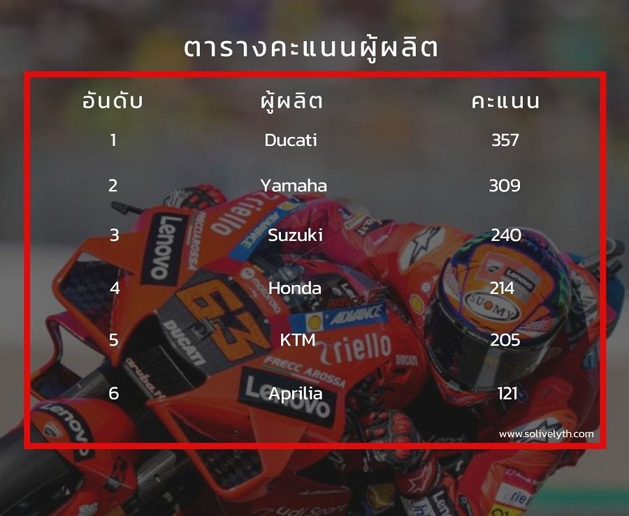 ฤดูกาลนี้ Ducati ได้คะแนนผู้ผลิตจากนักบิด 5 คน ทั้ง ฟรานเชสโก บันญาญา, แจ็ค มิลเลอร์, โยฮันน์ ซาร์โก, ฆอร์เก มาร์ติน และ อิเนีย บาสเตียนินี ทำให้ผู้ผลิตจากอิตาลีคว้าแชมป์โลกไปครองอีกสมัย