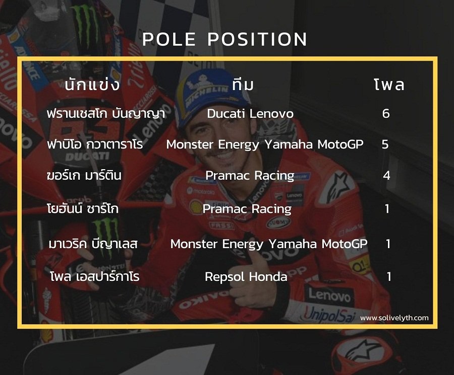 ฟรานเชสโก บันญาญา เป็นเจ้าพ่อโพลประจำฤดูกาล 2021 เขาสตาร์ทจากตำแหน่งที่ดีที่สุด 6 เรซ! ซึ่งในช่วงไม่กี่ปีที่ผ่านมาส่วนใหญ่โพลโพซิซั่นมักจะตกเป็นของนักบิดจาก Honda และ Yamaha แต่ฤดูกาลนี้ Ducati แรงมาก การแข่งขันมีทั้งหมด 18 สนาม นักบิดจาก Ducati ยึดตำแหน่งโพลไปแล้ว 11 สนาม!
