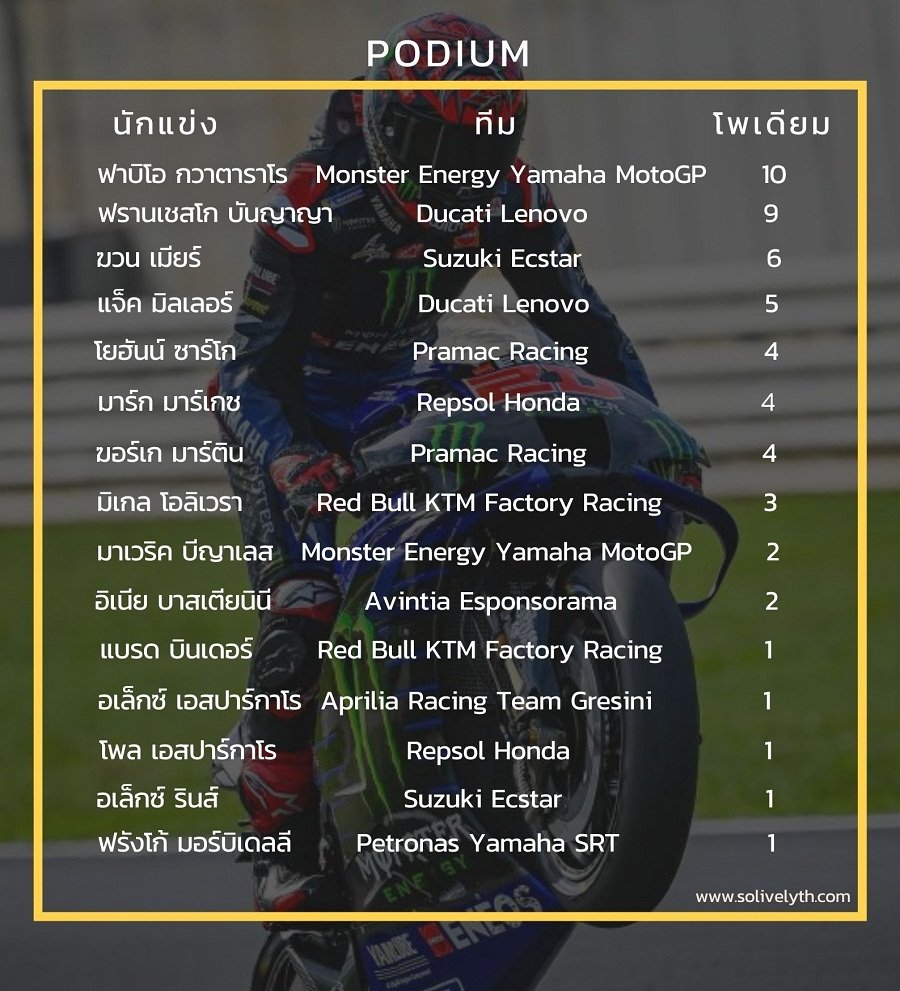 ฟาบิโอ กวาตาราโร แชมป์โลกจากทีม Monster Energy Yamaha MotoGP กวาดโพเดียมไปมากที่สุดในฤดูกาลนี้ โดยมี ฟรานเชสโก บันญาญา และ ฆวน เมียร์ ตามมาในอันดับ 2 และ 3 ส่วนฆอร์เก มาร์ติน และ อิเนีย บาสเตียนินี เป็นรุกกี้ 2 คนที่สามารถขึ้นโพเดียมได้ตั้งแต่ฤดูกาลแรกที่ขึ้นมาแข่งขันในระดับพรีเมียร์คลาส