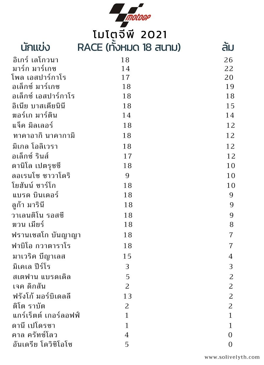 หลังจากเช็คสถิติคะแนนของนักแข่ง ทีม และผู้ผลิต ไปแล้วในบทความก่อน( ละเอียดยิบ! สรุปผลงานนักบิดโมโตจีพี 2021 ) บทความนี้เรามาดูสถิติการล้มของนักแข่งในคลาส MotoGP ฤดูกาล 2021 กันบ้าง ใครคือนักบิดจอมล้มประจำซีซั่นนี้ไปดูกันเลย