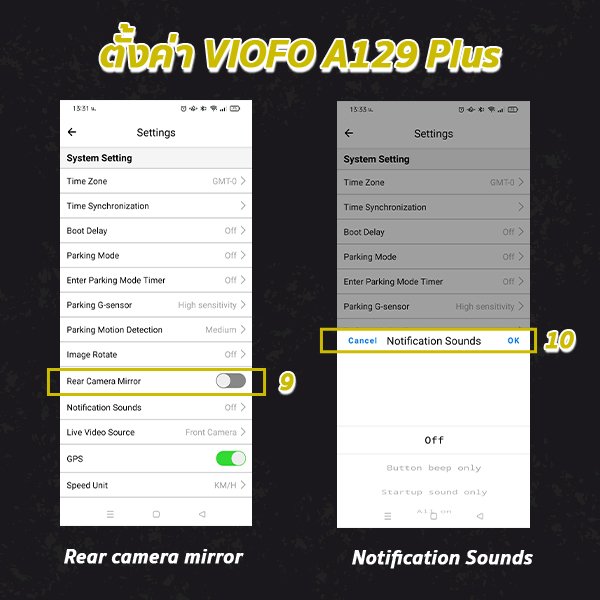 10. Notification Sounds เป็นการเปิด-ปิด เสียงแจ้งเตือนทั้งหมด ตั้งแต่ เสียงปุ่มกดที่กล้องติดรถยนต์ เสียงแจ้งเตือน เช่น เสียงแจ้งเตือนตอนเปิด-ปิดกล้องติดรถยนต์ เป็นต้น ซึ่งเลือกได้ว่าจะปิดทั้งหมด หรือเปิดทั้งหมด หรือปิด-เปิดแค่อย่างใดอย่างหนึ่งค่ะ
