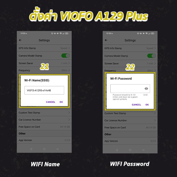 1. เข้าไปเปิด WIFI ที่กล้องติดรถยนต์ VIOFO A129 Plus Duo กดออกจากเมนูตั้งค่าในกล้องติดรถยนต์ รอสักครู่ให้ WIFI เปิด จากนั้นที่หน้าจอกล้องจะบอกชื่อ WIFI พร้อมรหัส WIFI