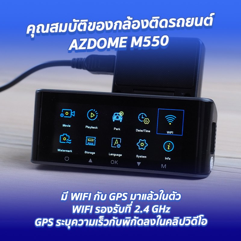 6. กล้องติดรถยนต์ AZDOME M550 มี WIFI ในตัวรองรับ WIFI ที่ 2.4 GHz หน้าที่ของ WIFI คือ ใช้สำหรับเชื่อมกล้องติดรถยนต์เข้ากับแอพ AZDOME เพื่อใช้งานกล้องติดรถยนต์ผ่านทางมือถือ ข้อดีของกล้องติดรถยนต์ที่มี WIFI คือ