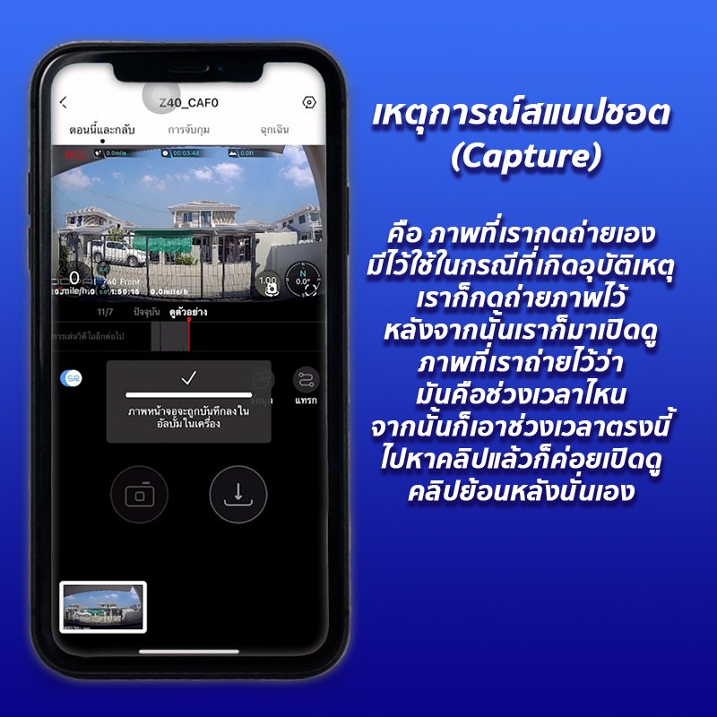 เหตุการณ์สแนปชอต (Capture) คือ ภาพที่เรากดถ่ายเอง มีไว้ใช้ในกรณีที่เกิดอุบัติเหตุ เราก็กดถ่ายภาพไว้ หลังจากนั้นเราก็มาเปิดดูภาพที่เราถ่ายไว้ว่ามันคือช่วงเวลาไหน จากนั้นก็เอาช่วงเวลาตรงนี้ไปหาคลิปแล้วก็ค่อยเปิดดูคลิปย้อนหลังนั่นเองค่ะ