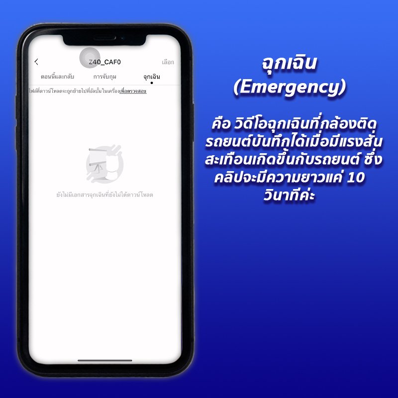ฉุกเฉิน (Emergency) คือ วิดีโอฉุกเฉินที่กล้องติดรถยนต์บันทึกได้เมื่อมีแรงสั่นสะเทือนเกิดขึ้นกับรถยนต์ ซึ่งคลิปจะมีความยาวแค่ 10 วินาทีค่ะ