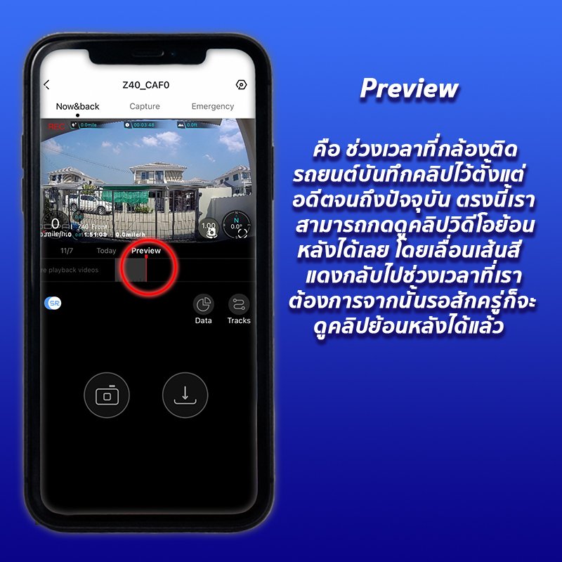 Preview คือ ช่วงเวลาที่กล้องติดรถยนต์บันทึกคลิปไว้ตั้งแต่อดีตจนถึงปัจจุบัน ตรงนี้เราสามารถกดดูคลิปวิดีโอย้อนหลังได้เลย โดยเลื่อนเส้นสีแดงกลับไปช่วงเวลาที่เราต้องการจากนั้นรอสักครู่ก็จะดูคลิปย้อนหลังได้แล้วค่ะ