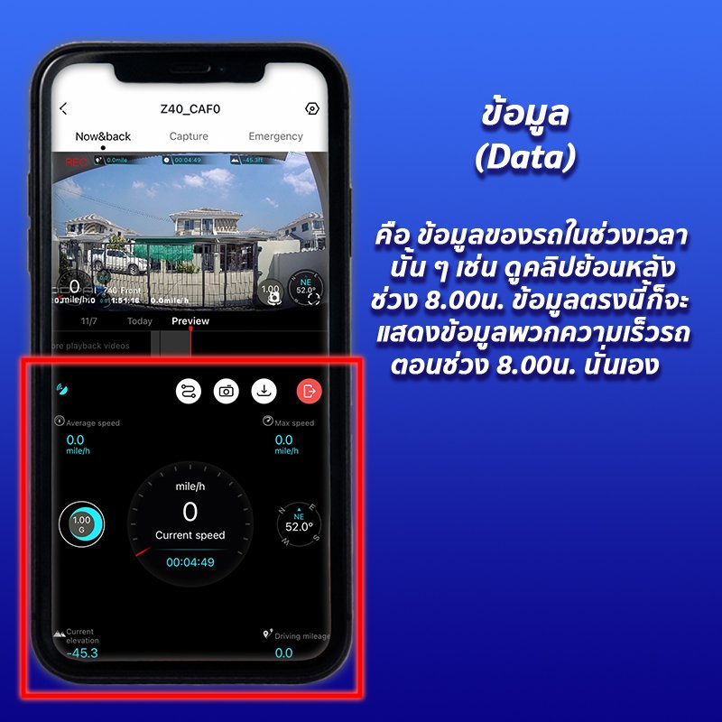ข้อมูล (Data) คือ ข้อมูลของรถในช่วงเวลานั้น ๆ เช่น ดูคลิปย้อนหลังช่วง 8.00น. ข้อมูลตรงนี้ก็จะแสดงข้อมูลพวกความเร็วรถตอนช่วง 8.00น. นั่นเองค่ะ