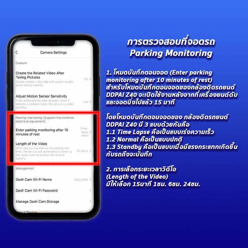 8. Parking Mode (โหมดบันทึกตอนจอด) คือ โหมดที่ทำงานหลังจากที่เครื่องยนต์ดับไปแล้วซึ่งตัวนี้จะใช้งานได้จะต้องต่อสายต่อตรง Hardwire Kit เท่านั้นและโหมดบันทึกตอนจอดของกล้องติดรถยนต์ DDPAI Z40 สามารถใช้งานได้ 3 แบบคือ Normal, Time Lapse, Standby (ซึ่งข้อมูลของโหมดบันทึกตอนจอดได้อธิบายไว้แล้วที่: ...)