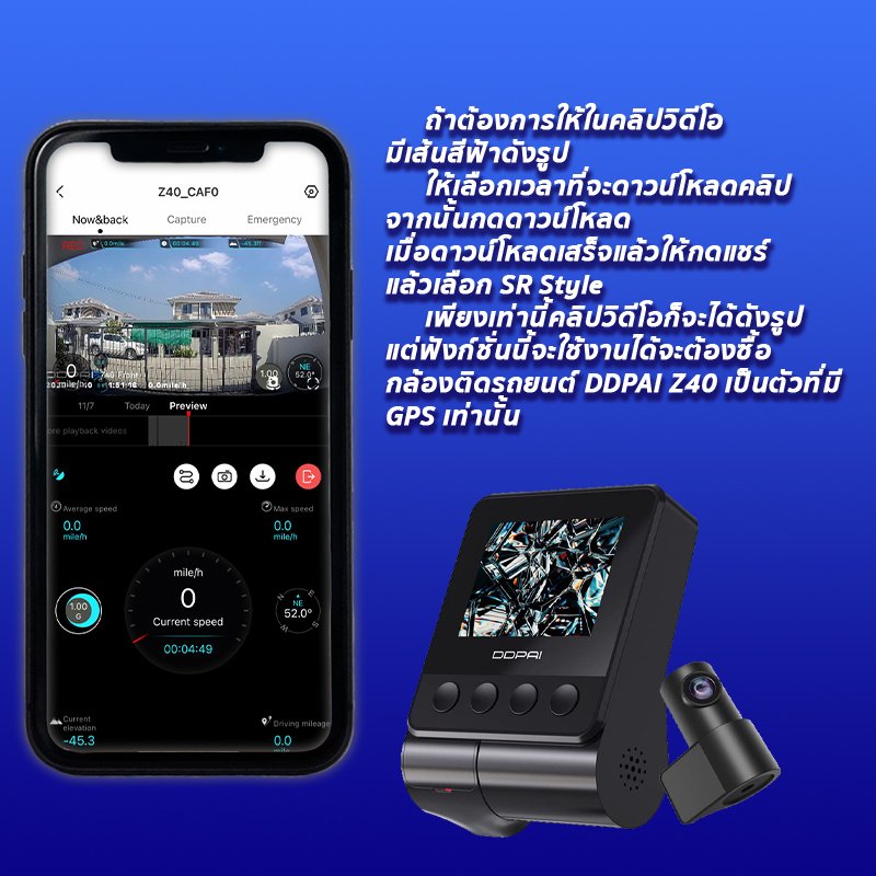 ถ้าต้องการให้ในคลิปวิดีโอมีเส้นสีฟ้าดังรูปให้เลือกเวลาที่จะดาวห์โหลดคลิปจากนั้นกดดาวห์โหลด เมื่อดาวห์โหลดเสร็จแล้วให้กดแชร์ แล้วเลือก SR Style เพียงเท่านี้คลิปวิดีโอก็จะได้ดังรูปค่ะ แต่ฟังก์ชั่นนี้จะใช้งานได้จะต้องซื้อกล้องติดรถยนต์ DDPAI Z40 เป็นตัวที่มี GPS เท่านั้นค่ะ