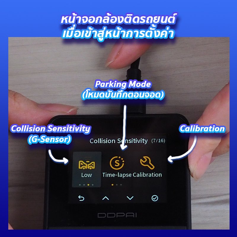 2. การปรับความไวในการชน (Adjust collision sensitivity) คือ ความไวในการตรวจจับแรงสั่นสะเทือนเพื่อให้กล้องติดรถยนต์บันทึกเป็นคลิปเป็นคลิปฉุกเฉิน แนะนำให้ตั้ง Low ค่ะ เพราะถ้าตั้ง Hight กล้องติดรถยนต์จะอ่อนไหวมากเพียงแค่ปิดประตูรถปกติก็บันทึกเป็นคลิปฉุกเฉินแล้ว เลยอาจจะทำให้เราได้คลิปฉุกเฉินที่ไม่จำเป็นเยอะมากเกินไปนั่นเองค่ะ