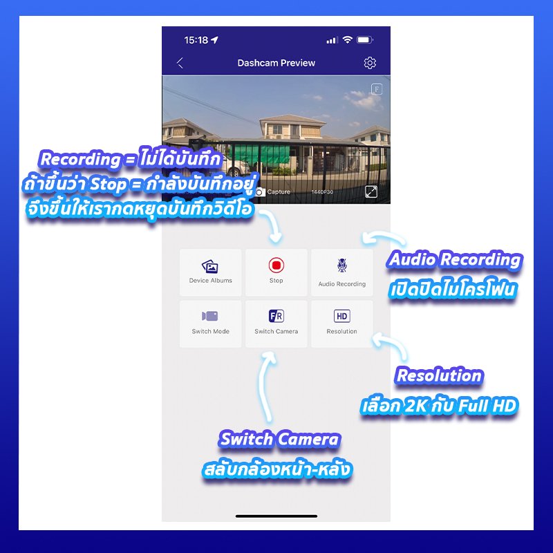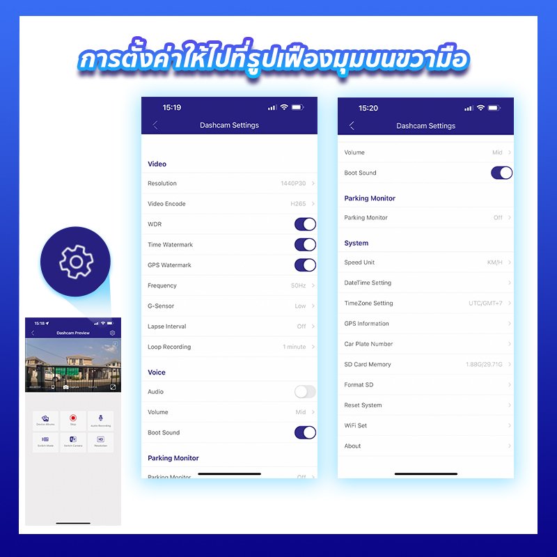 อันดับแรกให้ปรับมุมมองกล้องหน้ากับกล้องหลังให้ได้มุมที่พอดีค่ะ หลังจากปรับเสร็จแล้วตรงรูปเมมโมรี่การ์ดถ้าไม่ได้ใส่เมมโมรี่การ์ดมันจะขึ้นเป็นสีแดง, ตามด้วยกดถ่ายภาพ, ความละเอียดในการบันทึกวิดีโอ,และกดดูภาพจากกล้องติดรถยนต์แบบเต็มจอ