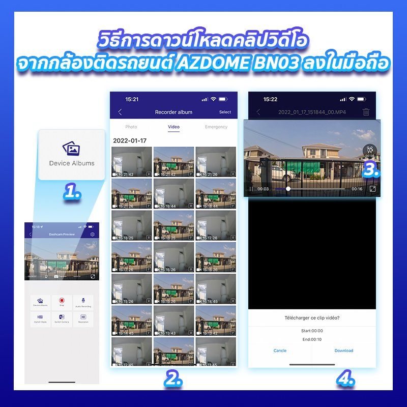 วิธีการดาวห์โหลดคลิปวิดีโอจากกล้องติดรถยนต์ AZDOME BN03 ลงในมือถือ