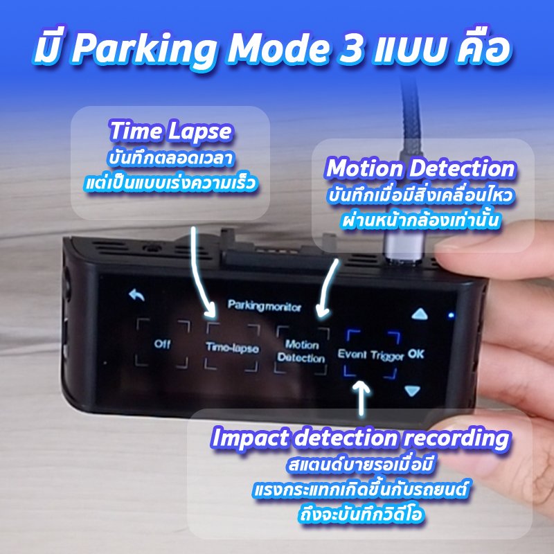 สำหรับ Parking Mode หรือ โหมดบันทึกตอนจอดของกล้องติดรถยนต์ Blueskysea B4K นั้นสามารถรองรับได้ 3 แบบ คือ