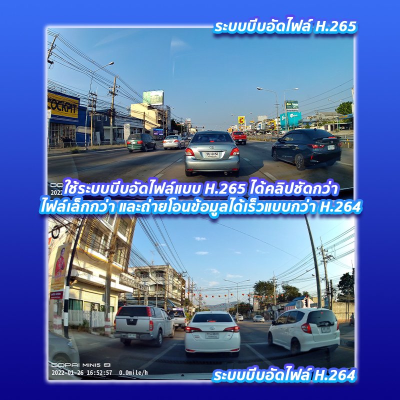 3. กล้องติดรถยนต์ DDpai MINI 5 สามารถเลือกใช้ระบบบีบอัดไฟล์เป็นแบบ H.265 ได้ ซึ่งระบบบีบอัดไฟล์แบบ H.265 เมื่อเปิดใช้งานจะทำให้คลิปมีความคมชัดมากกว่า และมีขนาดไฟล์เล็กกว่าระบบบีบอัดไฟล์แบบ H.264 ทำให้เวลาถ่ายโอนข้อมูลจะถ่ายโอนข้อมูลได้เร็วกว่านั่นเองค่ะ แต่ระบบบีบอัดไฟล์แบบ H.265 ยังมีข้อจำกัดอยู่ก็คือรองรับกับมือถือแค่บางรุ่นเท่านั้น ถ้ามือถือรุ่นไหนที่ยังไม่รองรับระบบบีบอัดไฟล์แบบ H.265 ตอนที่เปิดดูคลิปคลิปจะเป็นภาพสีดำนั่นเองค่ะ