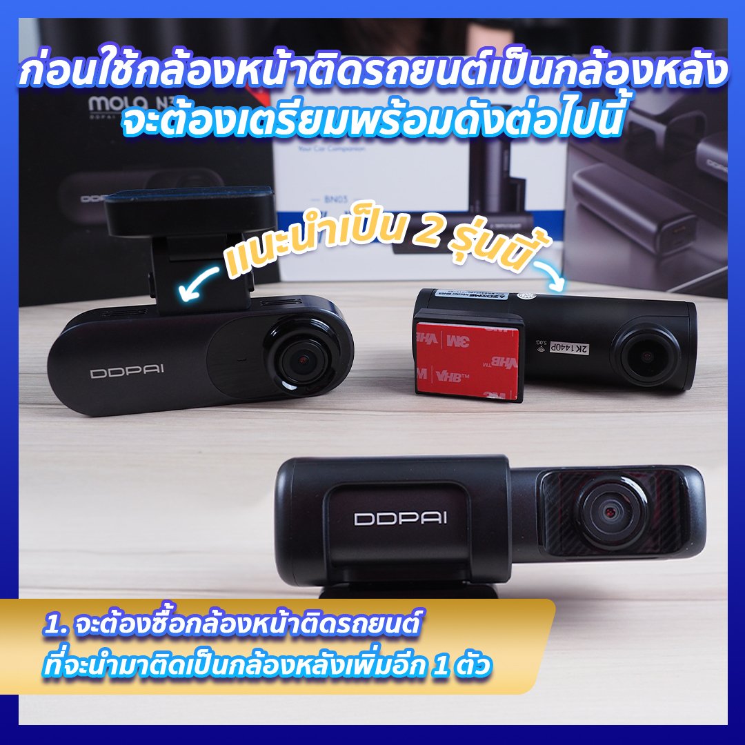1. จะต้องซื้อกล้องหน้าติดรถยนต์ที่จะนำมาติดเป็นกล้องหลังเพิ่มอีก 1 ตัว ซึ่งกล้องหน้าติดรถยนต์ที่จะนำมาติดเป็นกล้องหลังติดรถยนต์นั้นแนะนำให้เป็นกล้องหน้าติดรถยนต์ที่ไม่มีหน้าจอ ส่วนกล้องหน้าติดรถยนต์ที่ติดหน้ารถกับกล้องหน้าติดรถยนต์ที่จะนำมาติดหลังรถนั้น จะเป็นตัวเดียวกัน หรือคนละตัวแต่แบรนด์เดียวกัน หรือ คนละแบรนด์กันไปเลยก็สามารถใช้ได้หมดเลยค่ะ