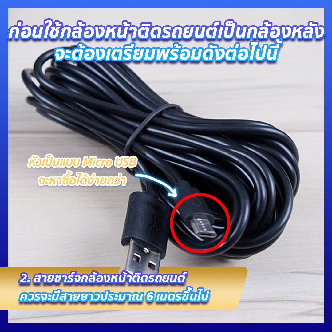 เพิ่มเติม : สายชาร์จของกล้องหน้าที่มีความยาว 6 เมตรและเป็นหัวเป็นแบบ Micro USB จะหาซื้อได้ง่ายกว่าสายชาร์จที่มีหัวเป็นแบบ MINI USB กับ Type C USB ค่ะ
