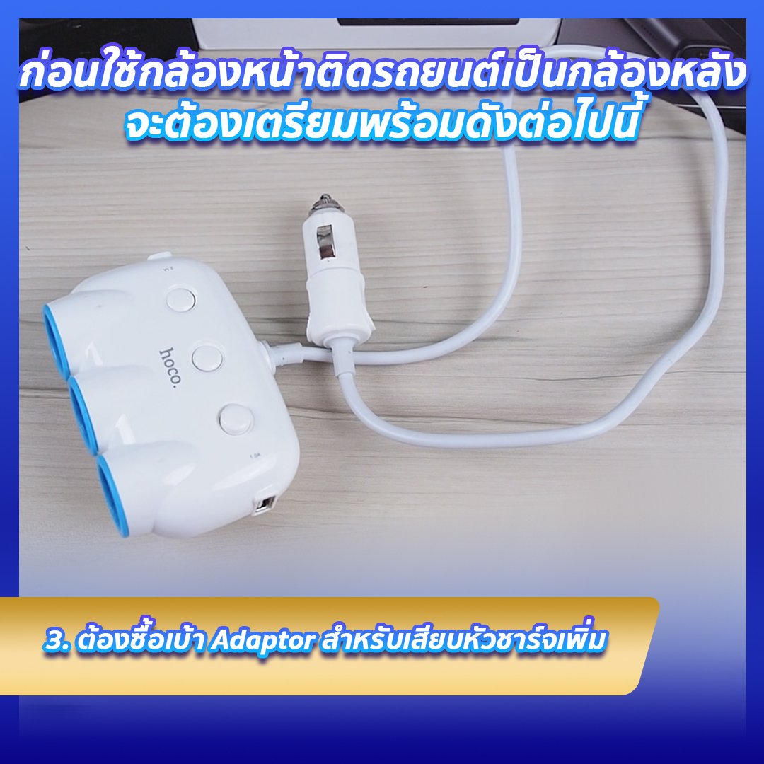 3. ต้องซื้อเบ้า Adaptor สำหรับเสียบหัวชาร์จเพิ่ม เพราะว่าเราใช้กล้องหน้าติดรถยนต์ 2 ตัวนั่นเองค่ะ ซึ่งกรณีที่ 1 ถ้าหัว Adaptor ของกล้องหน้ามีพอร์ต USB ให้ 2 ช่องอันนี้ก็คือดีไปเพราะ ช่องหนึ่งจะได้เสียบกล้องหน้าส่วนอีกช่องก็เสียบกล้องหน้าที่ติดเป็นกล้องหลัง