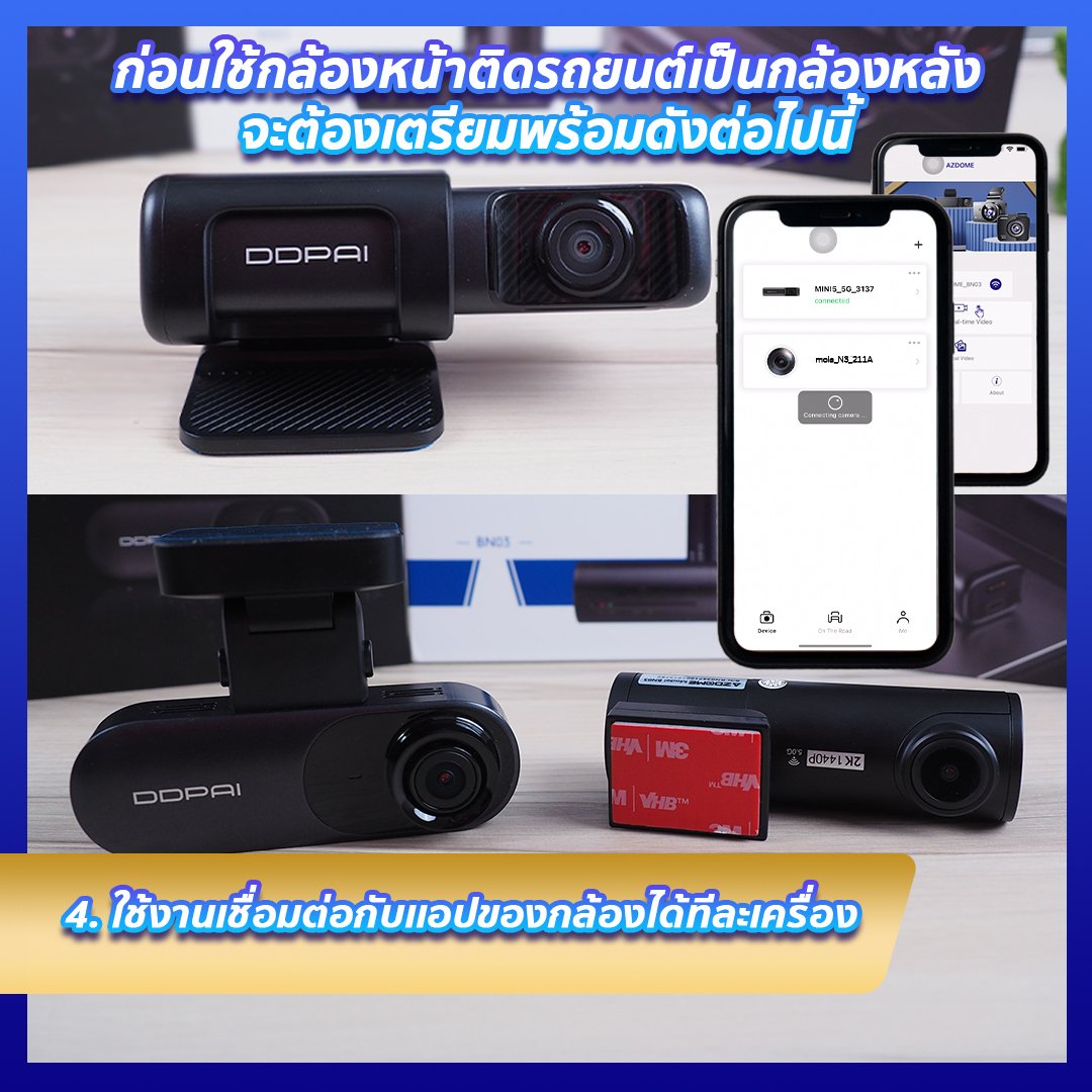 4. การใช้งานอาจจะหลายต่อนิดหนึ่ง เพราะว่าเนื่องจากมันเป็นกล้องหน้ากันทั้ง 2 คู่ เวลาที่จะตั้งค่า ดูคลิปแบบ Real Time ดูคลิปวิดีโอย้อนหลัง หรือดาวห์โหลดคลิปวิดีโอจากกล้องติดรถยนต์ลงมือถือ มันจะไม่สามารถทำพร้อมกันได้ในแอพเดียวกัน ไม่ว่าจะเป็นกล้องหน้านั้นจะเป็นรุ่นเดียวกันก็ตามนะ เวลาที่จะใช้งานก็จะต้องใช้งานทีละกล้อง เช่น ถ้าใช้กล้องหน้าก็ให้ใช้กล้องหน้าให้เสร็จก่อนแล้วค่อยยกเลิกการเชื่อม WIFI ของกล้องหน้า แล้วไปเชื่อม WIFI ของกล้องหน้าที่ติดเป็นกล้องหลังแทนแล้วค่อยใช้งานต่อ และถ้ากล้องหน้าที่ใช้เป็นคนละแบรนด์กันก็อย่าลืมที่จะสลับแอพที่จะใช้งานด้วย เช่น กล้องหน้า DDPAI กล้องหน้าติดหลังคือ AZDMOE ตอนจะไปใช้งานกล้องหน้าติดหลังก็อย่าลืมสลับจากแอพ DDPAI เป็นแอพ AZDOME นั่นเองค่ะ