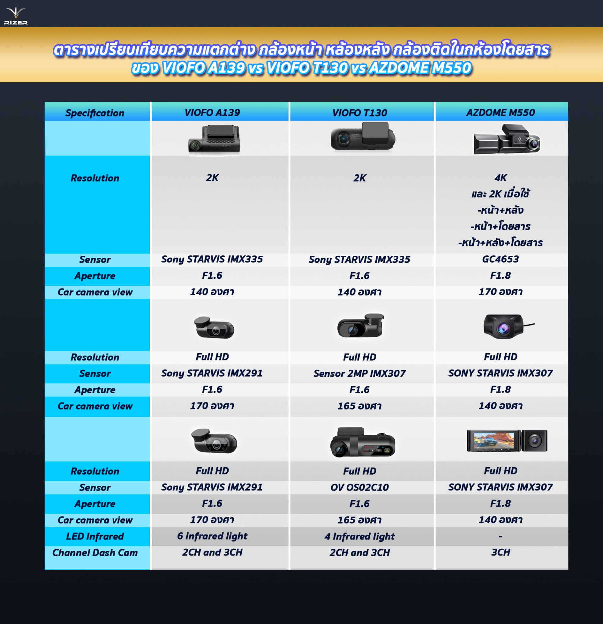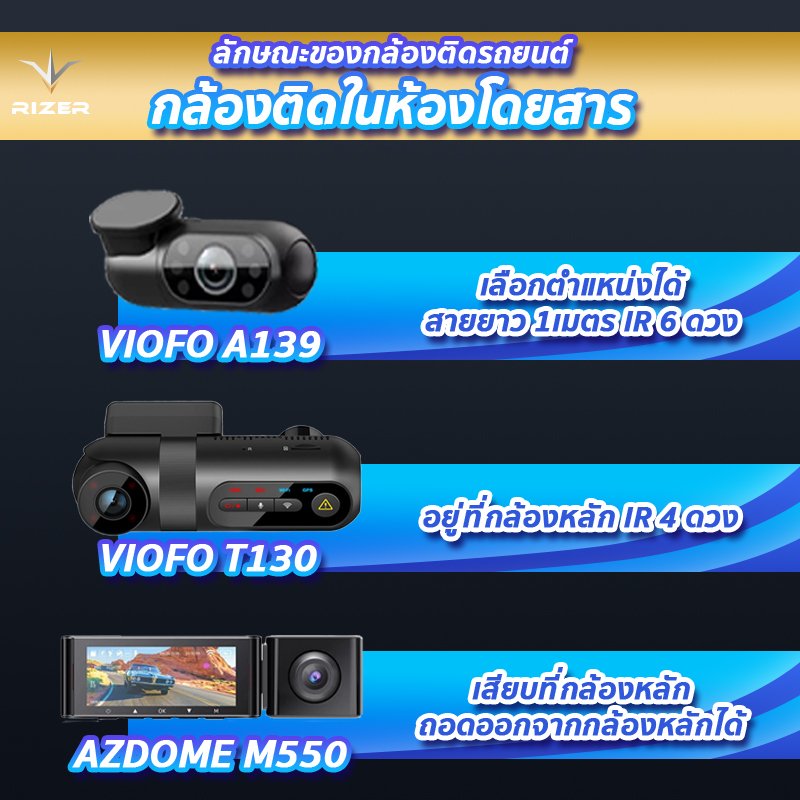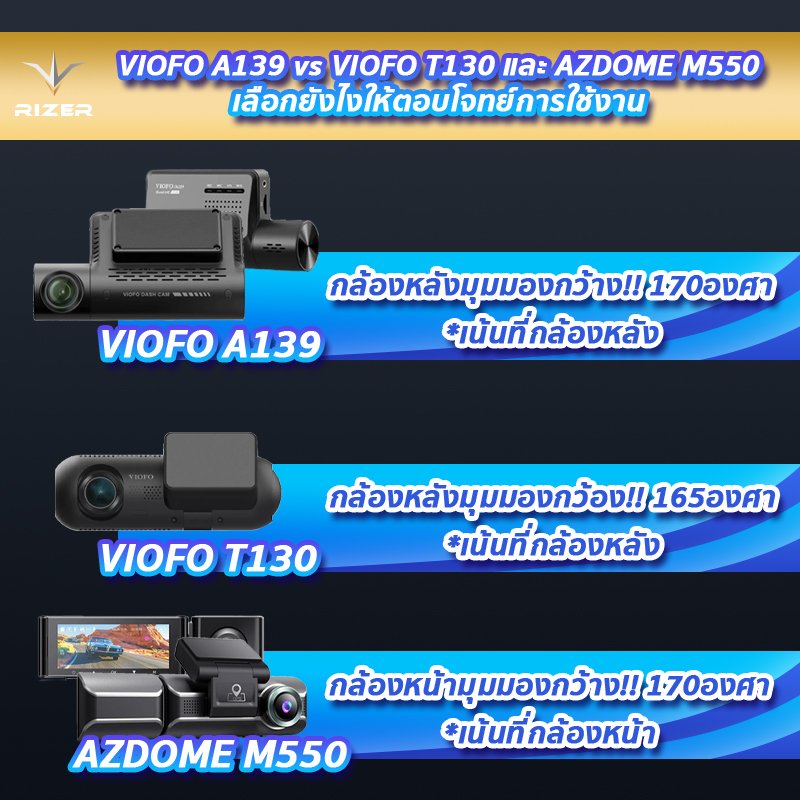 ตารางเปรียบเทียบความแตกต่าง กล้องหน้า หล้องหลัง กล้องติดในกห้องโดยสารของ VIOFO A139 vs VIOFO T130 vs AZDOME M550