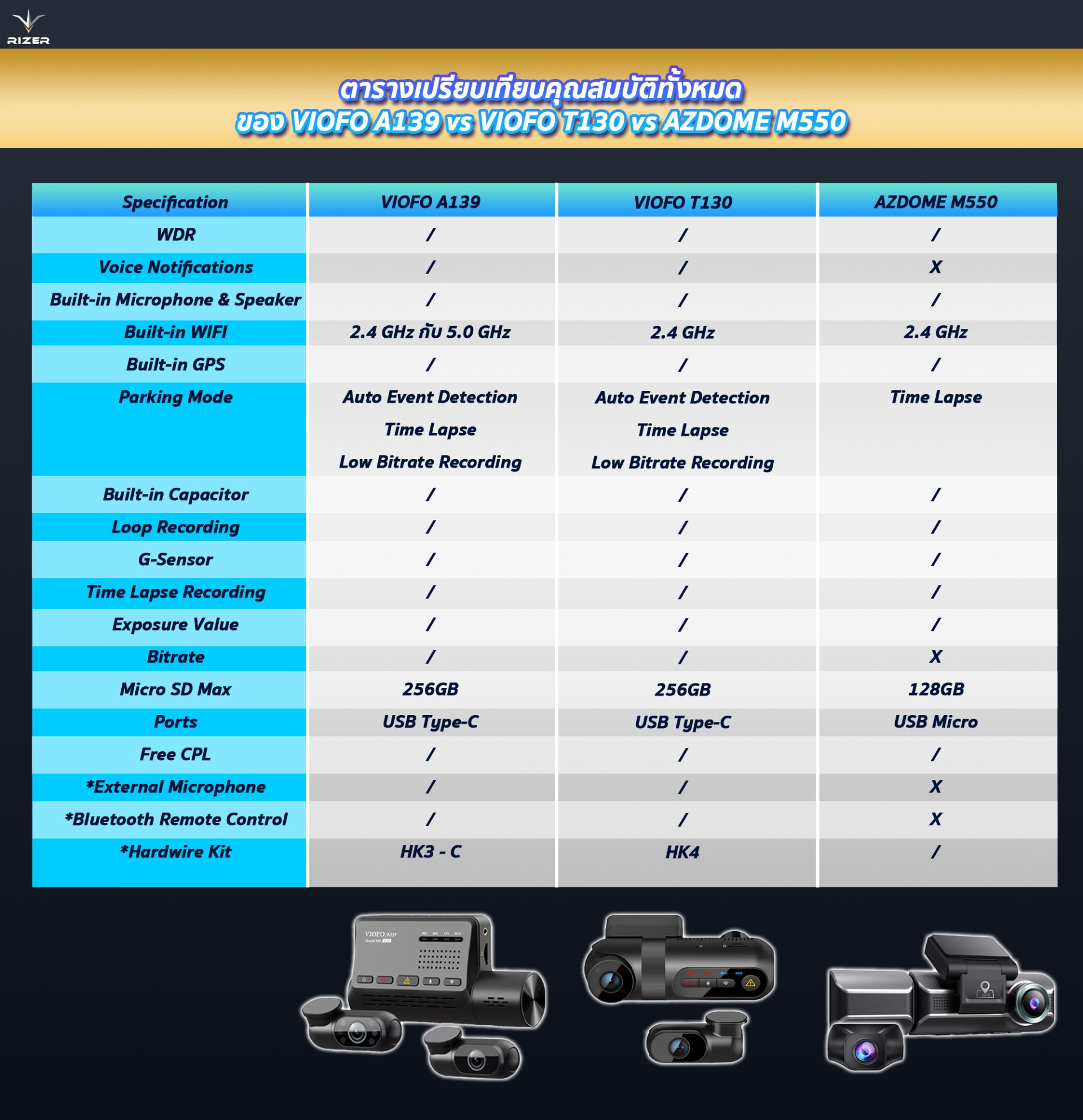 ตารางเปรียบเทียบคุณสมบัติทั้งหมดของ VIOFO A139 vs VIOFO T130 vs AZDOME M550